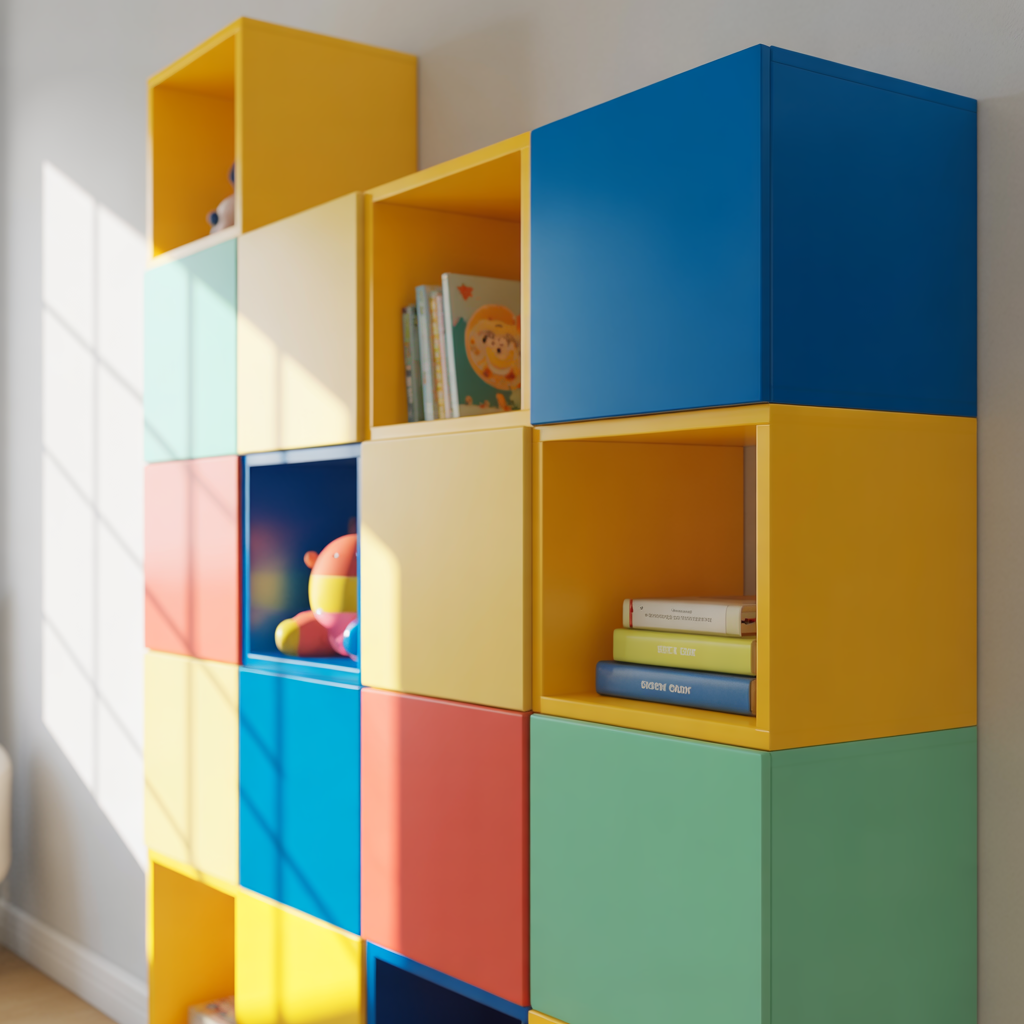 The EKET modular cabinets allow parents to design customized wall storage layouts. Arrange square units in fun patterns to create both open and closed storage areas. This adds personality while keeping clutter hidden.