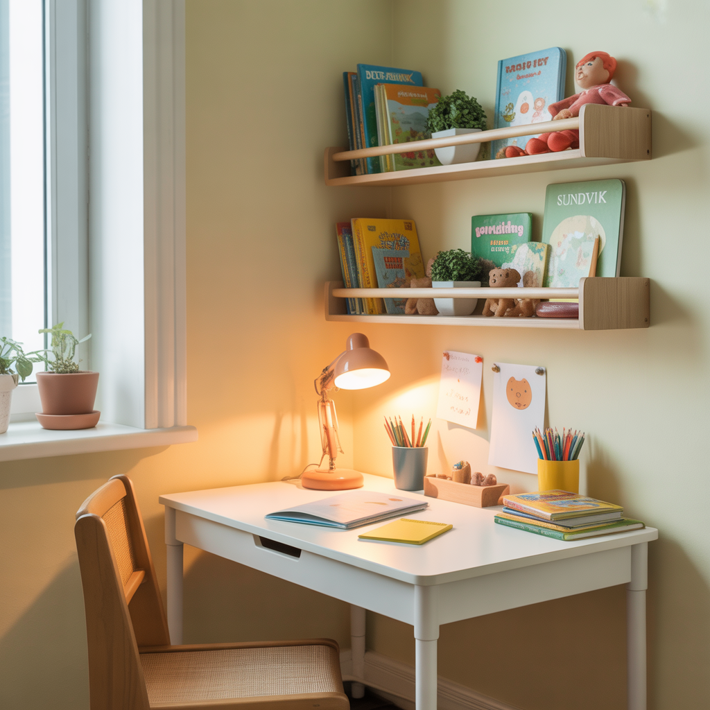 Parents love establishing a consistent homework routine with a designated desk area. Pair it with wall shelves above for organized school supplies. As academic responsibilities grow, this desk becomes an essential productivity space within the bedroom.