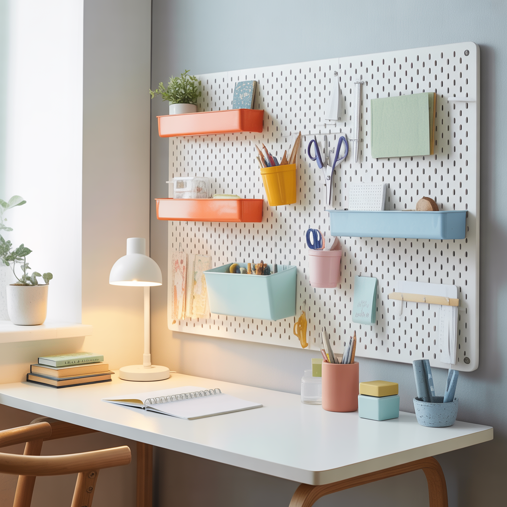 The SKÅDIS pegboard is a brilliant way to keep small items organized and off the floor. Use hooks and small containers to hold craft supplies, headphones, accessories, or tiny toys.