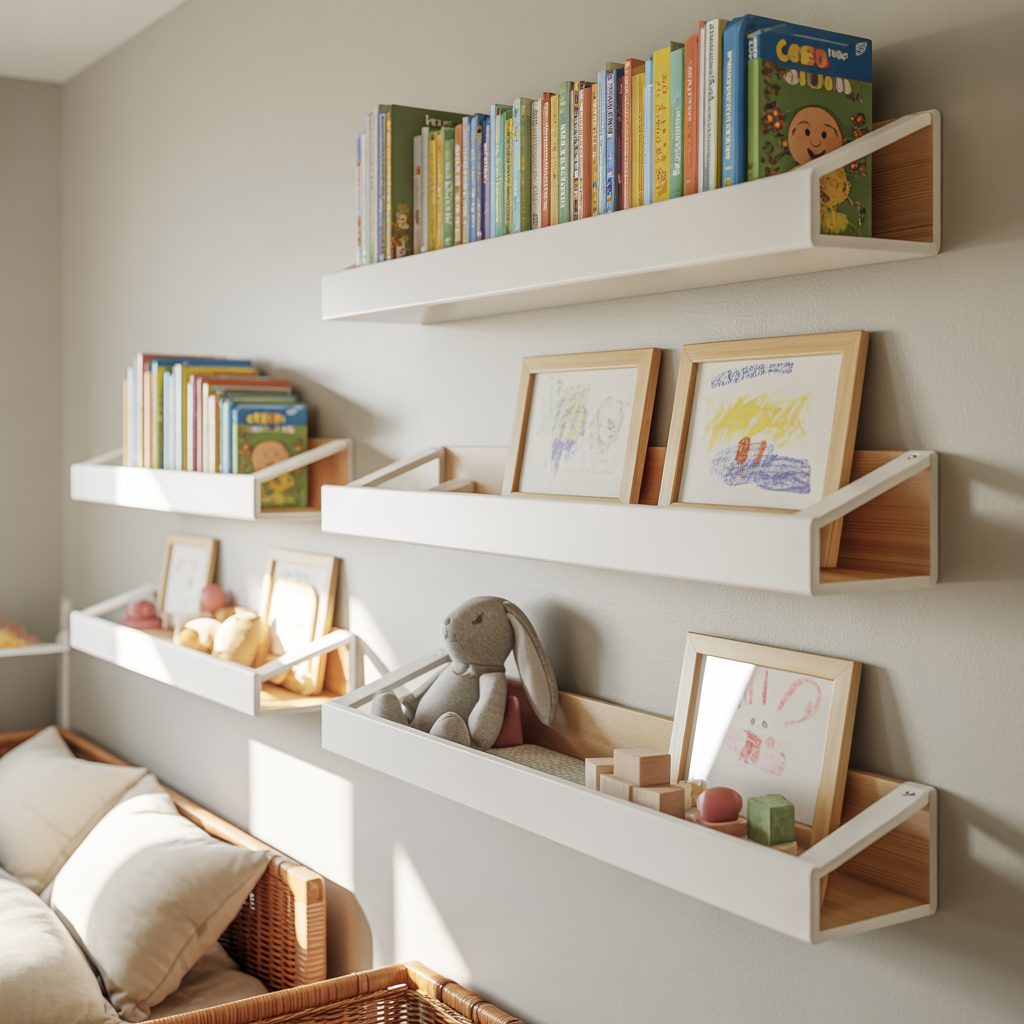 Parents love how affordable and versatile these shelves are. You can paint them to match your color scheme or keep them white for a clean aesthetic. As kids grow, the displayed items naturally change — from stuffed animals to school awards and décor pieces. The floating design keeps the room feeling open and uncluttered, while still giving children a sense of pride in displaying their favorite things.