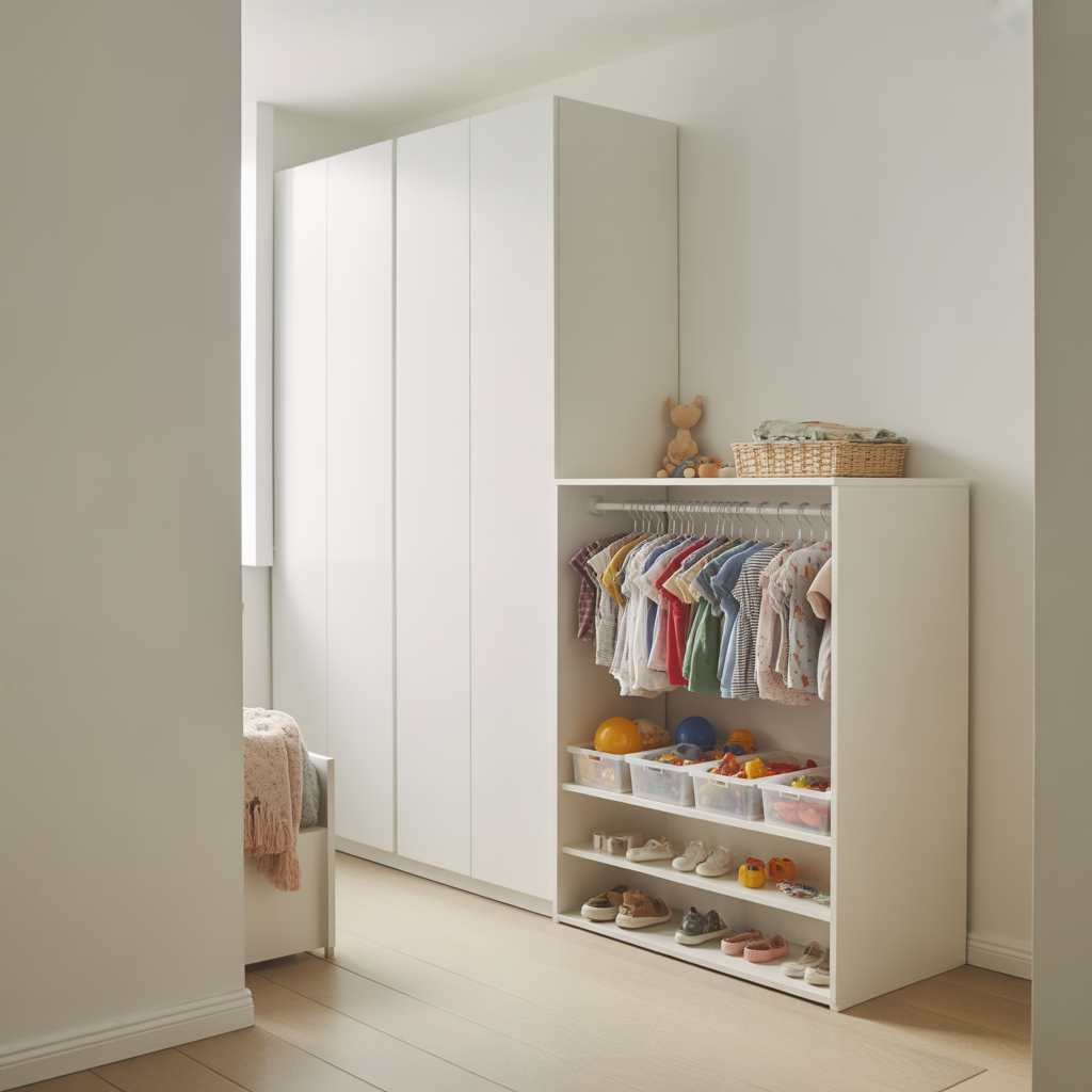 The SMÅSTAD wardrobe system is designed specifically with children in mind. Its modular components allow parents to combine hanging space, drawers, and shelving into one cohesive unit. This makes organizing clothes, shoes, and accessories much easier while maintaining a clean, modern aesthetic.