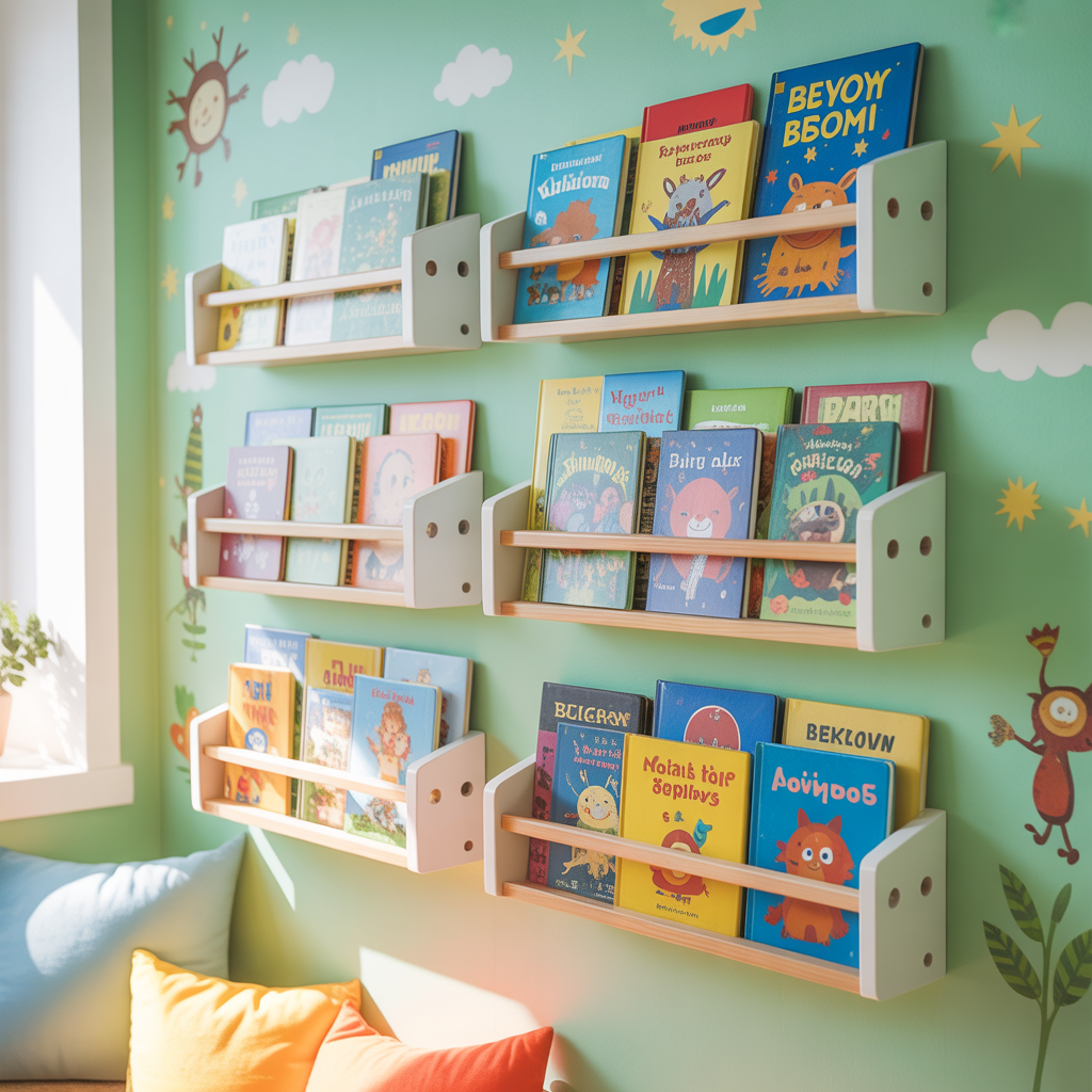 Install multiple rows to create a mini library wall that grows with your child. For toddlers, place shelves lower for easy reach. As they grow older, add higher rows for chapter books and school supplies. The natural wood finish blends beautifully with any color scheme, making it both decorative and functional. Parents especially love how this simple solution reduces clutter while promoting independence and learning.