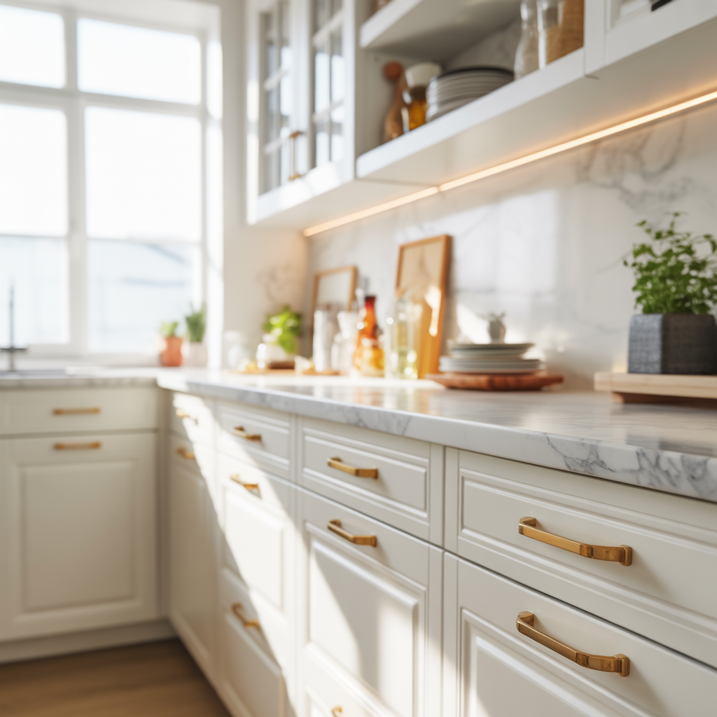 One of the easiest upgrades is replacing standard handles with brushed brass or gold hardware. Metallic accents instantly add warmth and elegance to neutral cabinets. Even basic white or gray IKEA cabinets can look luxurious with the right hardware choice.