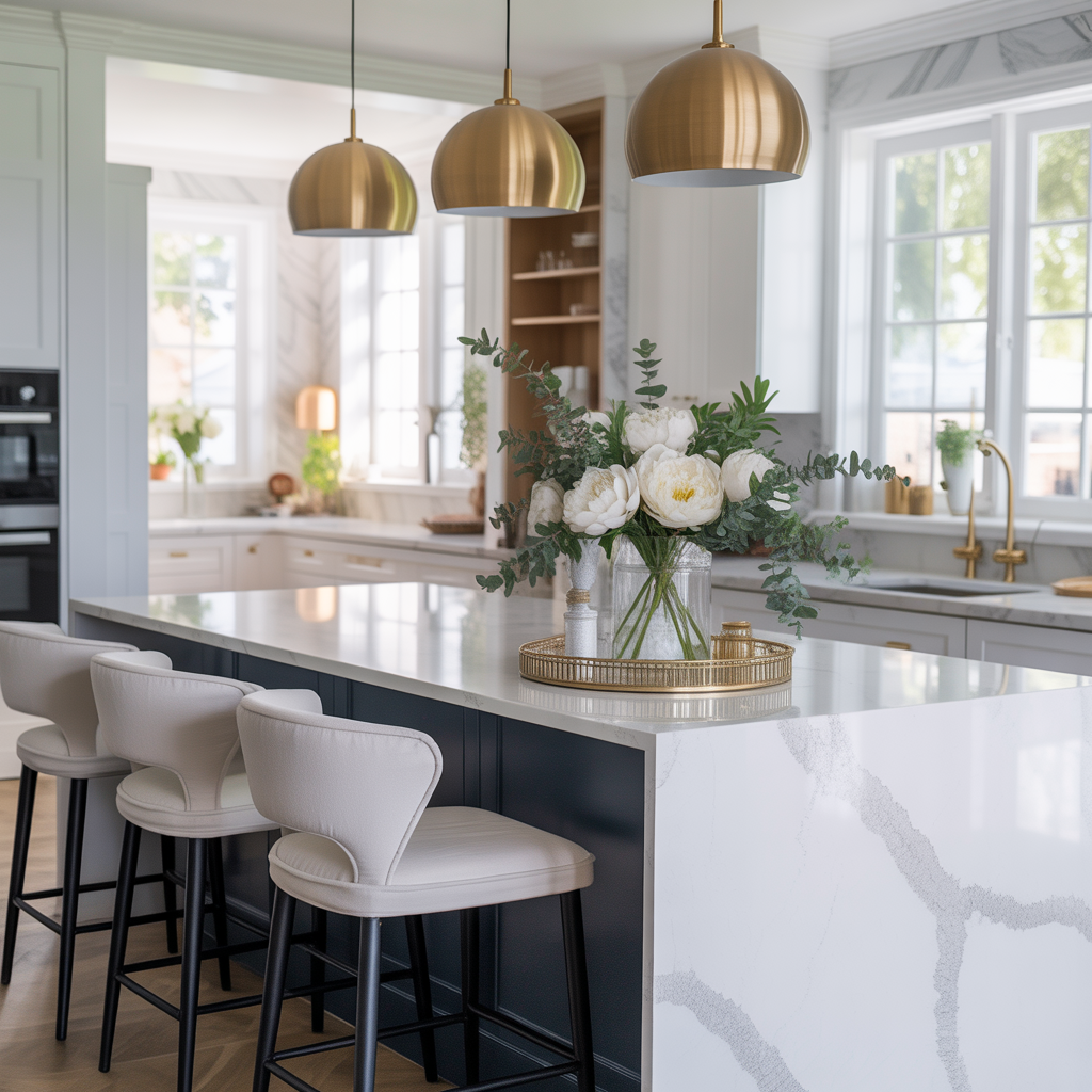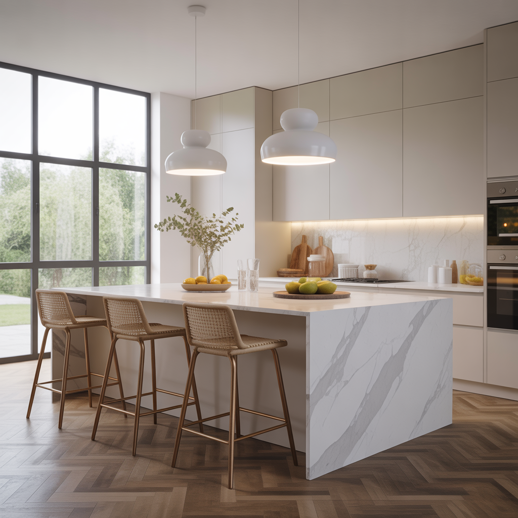 Waterfall edges on kitchen islands are especially eye-catching and scream high-end design. The smooth surface and subtle veining create a timeless elegance that works in both modern and classic kitchens.