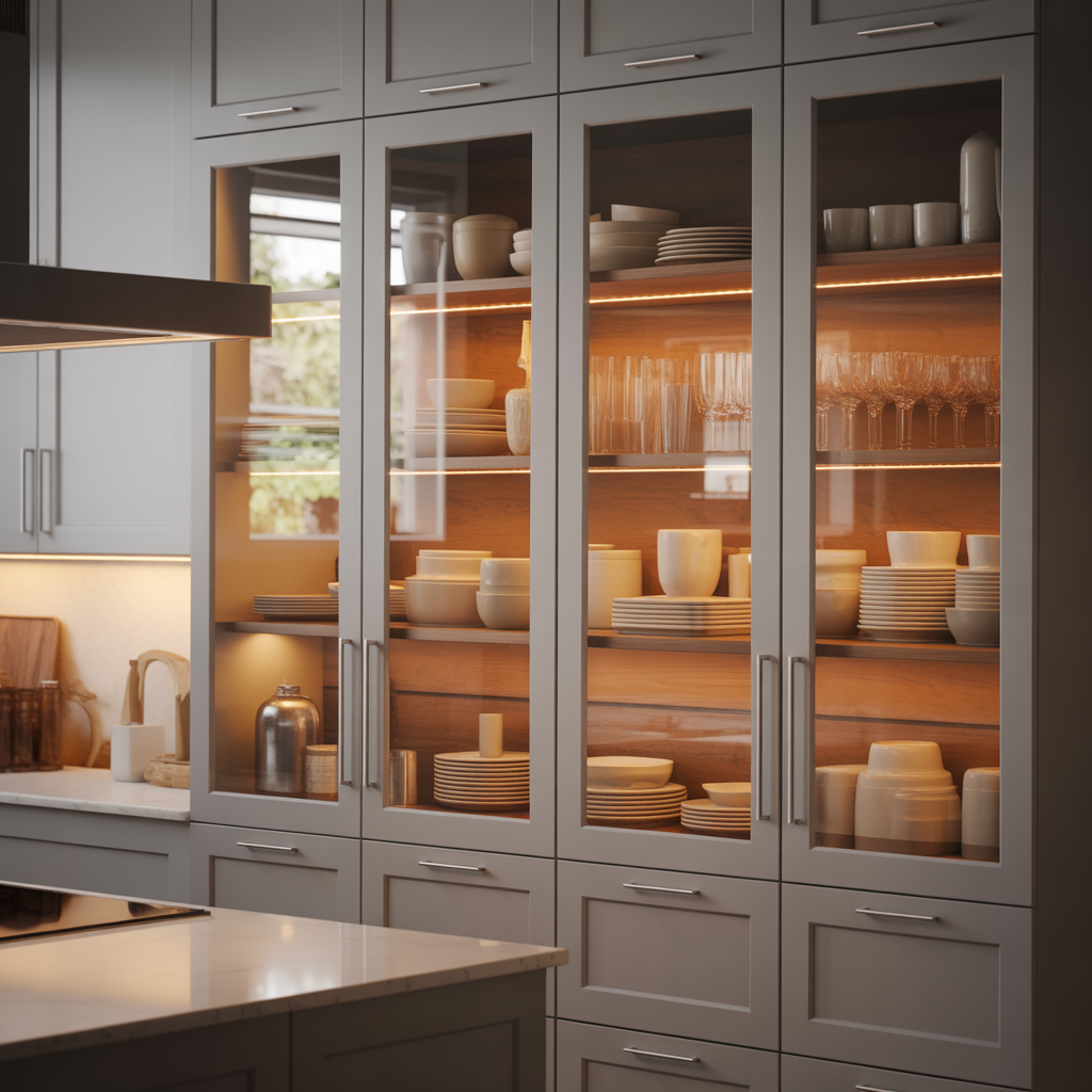 Choose ribbed or frosted glass for a subtle, sophisticated look. Interior lighting inside glass cabinets enhances the luxurious feel and makes your kitchen look professionally styled.