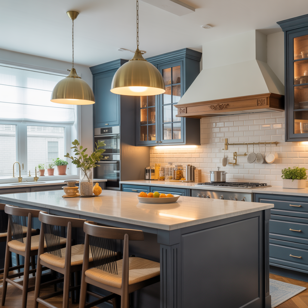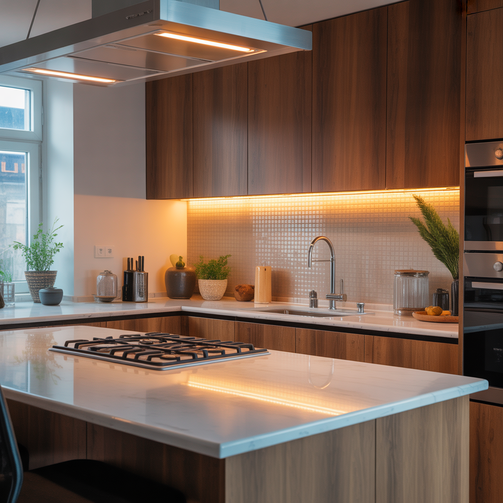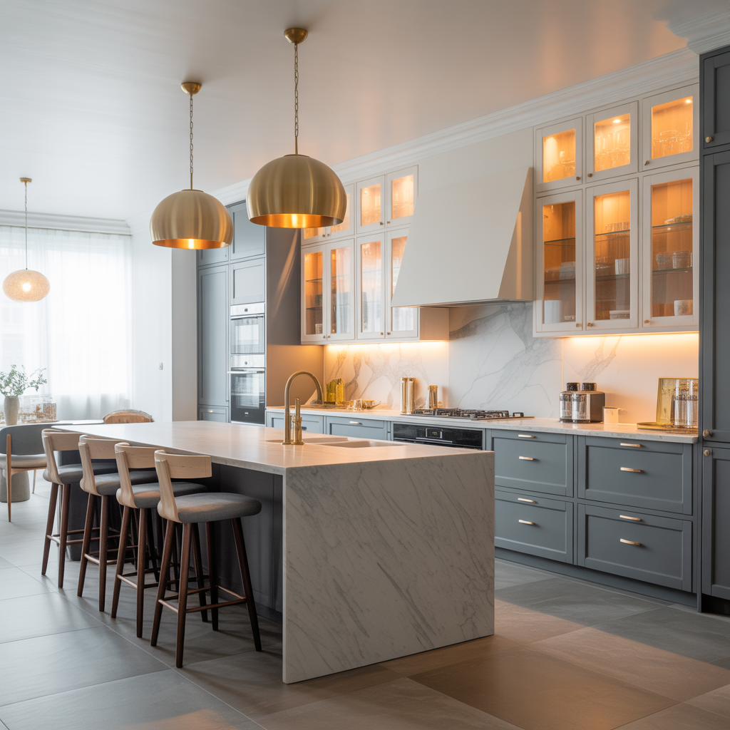 Combine pendant lighting, under-cabinet LED strips, and soft ambient lighting. Warm light enhances textures and adds depth.