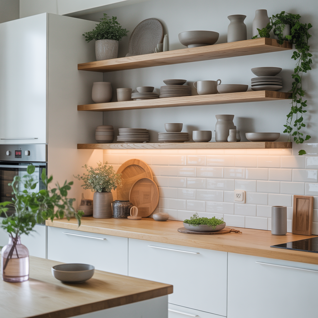 Open wooden shelving is a beautiful way to soften the clean lines of IKEA cabinets while adding warmth and personality to your kitchen. Replacing one or two upper cabinets with floating wood shelves instantly creates an airy and modern look. Natural wood tones bring in texture and contrast, especially when paired with white, beige, or gray cabinetry. This combination blends Scandinavian simplicity with a cozy, lived-in charm that feels intentional and high-end.