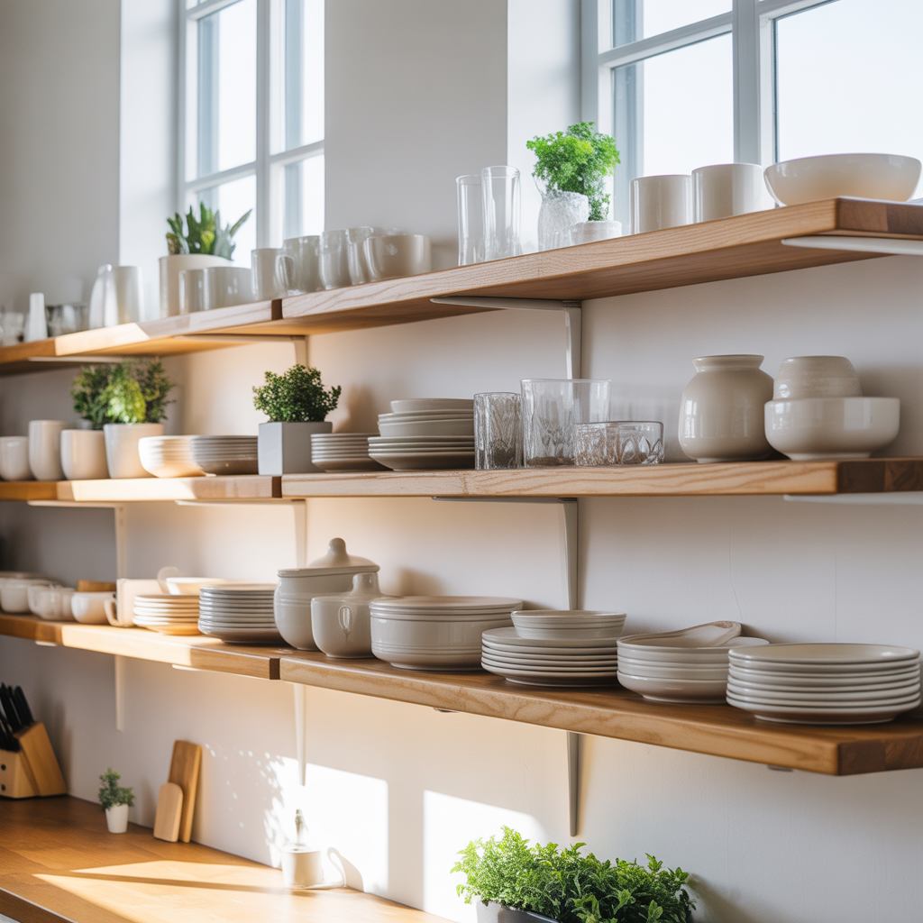 Replacing upper cabinets with open shelving gives your kitchen a modern and spacious feel. Install sturdy wooden or metal brackets and mount shelves securely to the wall. This setup allows you to display dishes, glassware, and decorative items in an organized and visually appealing way. Light wood shelves add warmth, while white shelves create a clean and minimalist look.