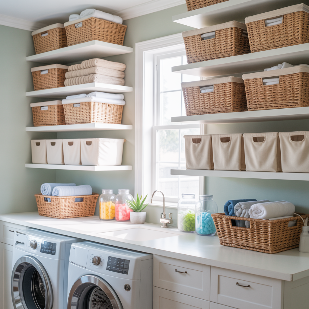A laundry room makeover can make everyday chores more enjoyable. Start by adding shelves above the washer and dryer for detergent storage and decorative baskets. Fresh paint in a light, cheerful color can instantly brighten the space. Installing hooks for cleaning tools and ironing supplies keeps everything organized and accessible.