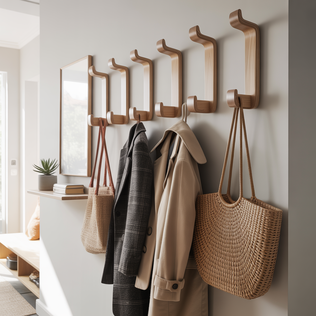 Installing wooden wall hooks is a simple yet highly practical upgrade. You can create custom hooks using wooden dowels or purchase ready-made hooks and mount them securely on the wall. Arrange them evenly in a straight line or creative pattern for added visual interest. Choose finishes that match your home’s decor for a cohesive look.