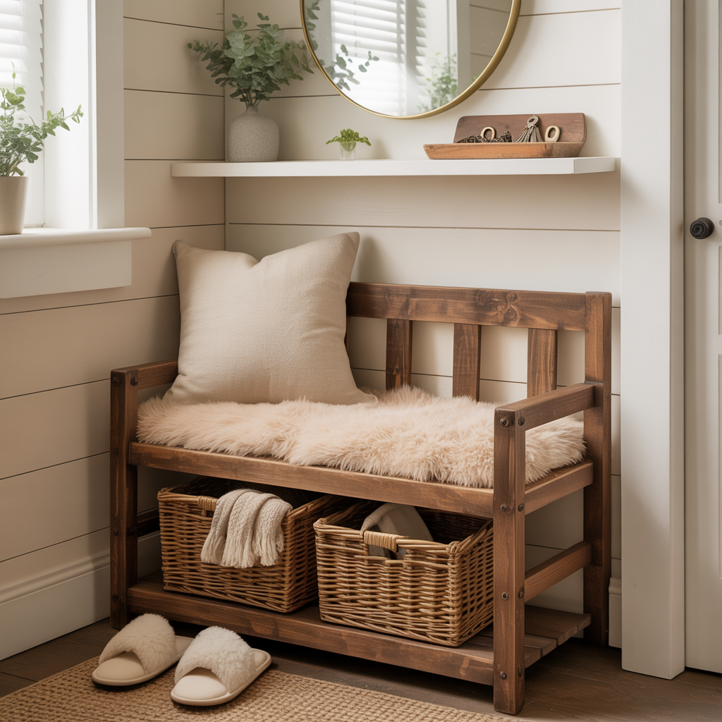 An entryway bench with built-in shoe storage is both practical and stylish. This project helps reduce clutter while creating a welcoming first impression. You can build a simple wooden bench with cubbies underneath or repurpose an old shelf unit. Add a soft cushion on top and decorative baskets inside the compartments for organized storage.