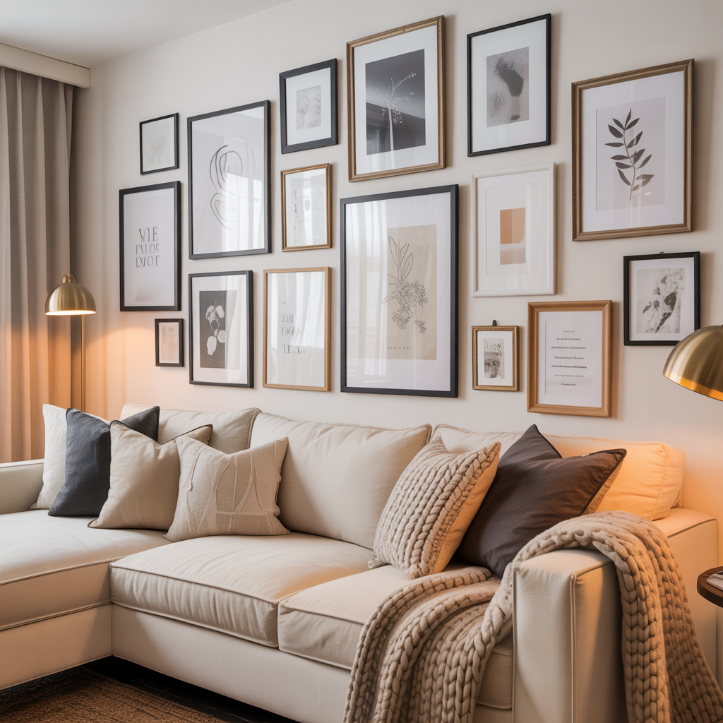 A gallery wall adds personality and warmth to any room. Gather framed art prints, family photos, quotes, and wall decor pieces that reflect your style. Arrange them on the floor first to find the perfect layout before hanging. You can go symmetrical for a clean look or mix sizes for a more artistic feel.
