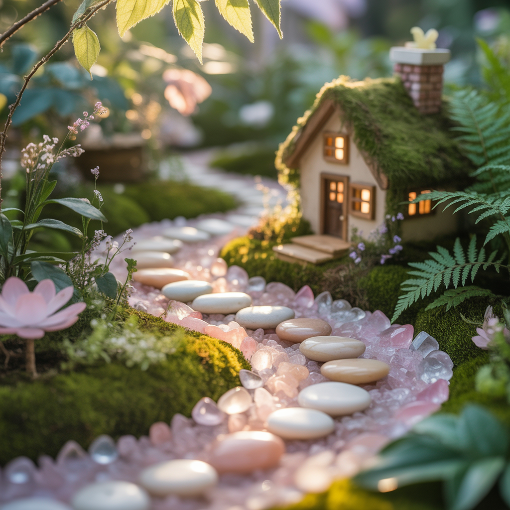 Decorative stones and tiny crystals add sparkle and texture to your fairy garden. Use polished pebbles, colorful gravel, or small crystal pieces to create magical accents. Scatter them along pathways, around the fairy house, or near water features for subtle shimmer. Clear quartz or pastel-colored stones work beautifully for a dreamy, enchanted vibe.