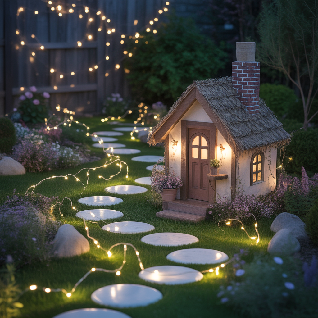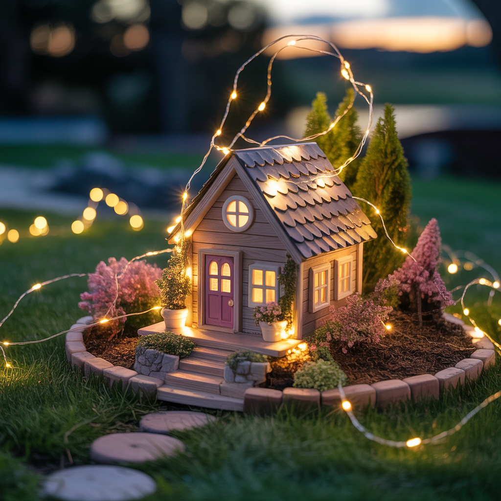 Adding miniature fairy lights instantly transforms your garden from cute to magical. Soft glowing lights create a dreamy atmosphere, especially in the evening. Use battery-operated micro LED string lights, as they are safe, lightweight, and easy to hide within plants and decorations. Carefully weave the lights around the fairy house, tuck them under moss, or wrap them around miniature trees to create a glowing woodland effect. Warm white lights give a cozy cottage vibe, while soft golden tones enhance a mystical fairy-tale look.