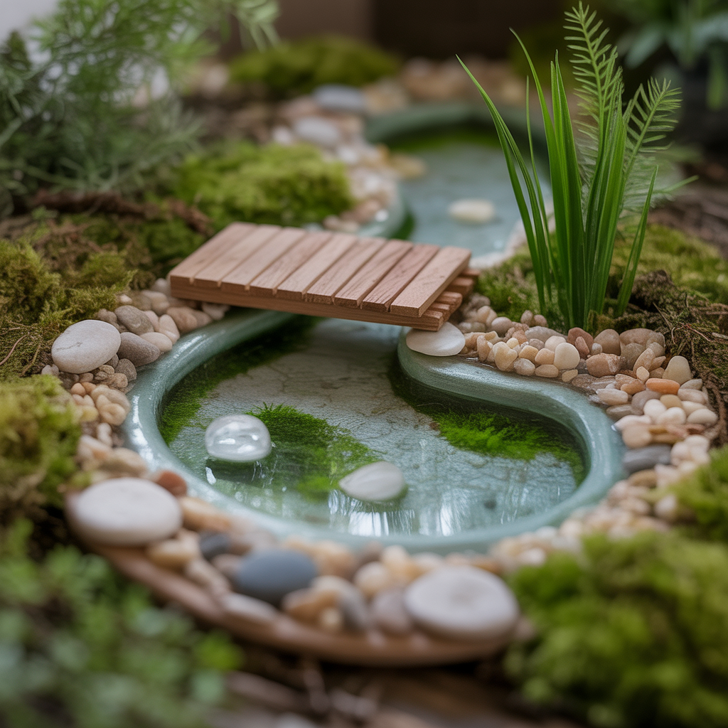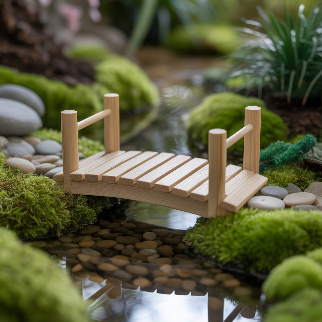 A tiny bridge adds whimsy and architectural interest to your fairy garden. Place it over a small pond, pebble stream, or even across a mossy section to create the illusion of different garden levels. Mini wooden or resin bridges are easy to find, or you can craft one from popsicle sticks for a handmade touch.