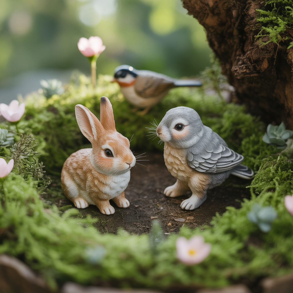 Miniature animals bring life and personality to your fairy garden. Tiny birds, rabbits, deer, hedgehogs, or even butterflies make the space feel animated and playful. Choose figurines that match your theme — woodland animals for a forest vibe or tiny farm animals for a countryside feel. Place them naturally near plants, pathways, or water features to create storytelling moments.